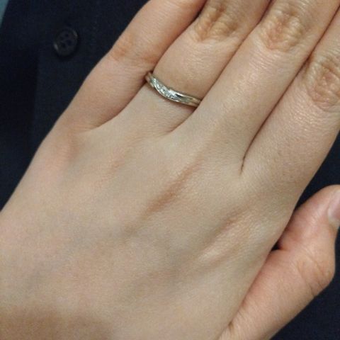 シンプルなデザインで、小さく綺麗なダイヤが斜めにデザインされていて、結婚指輪らしく、けど主張しすぎず大人らしいデザインがお気に入りです。男性側も女性側のダイヤ部分と同じように斜めにデザインが入っているのも魅力です。
