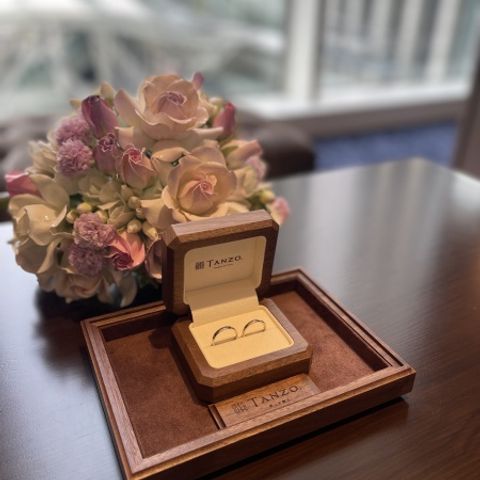 鍛造製法でつくられており強度もあるとのことなので、安心してつけることができ嬉しいです。また、2人とも指輪の厚さや色味など好みがちかったので、それぞれ変えることができました。指輪の箱もウォールナットでとても素敵でした。