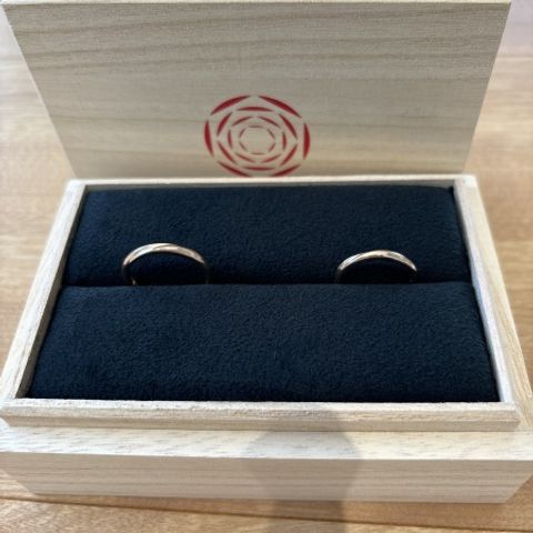 出雲結には様々なデザインの指輪があります。 私たちはシンプルな指輪がよく、普段から指輪をつけていない人にも違和感なくつけれるデザインを選びました。 また指輪の加工は、上下鏡面仕上げ、中央はヘアラインにすることで落ち着いた大人っぽい仕上がりになりました。
