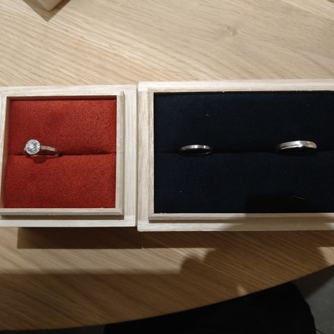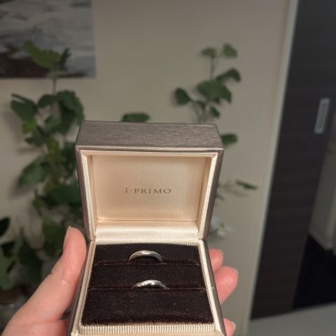指輪は細めのデザインで指輪の真ん中のデザインが他店の指輪には無かったので、可愛いと思いこちらに決めました!男性指輪もシンプルで細めのデザインでお互いに気に入っています。 内側にイニシャルも印字して可愛く仕上がり満足です!