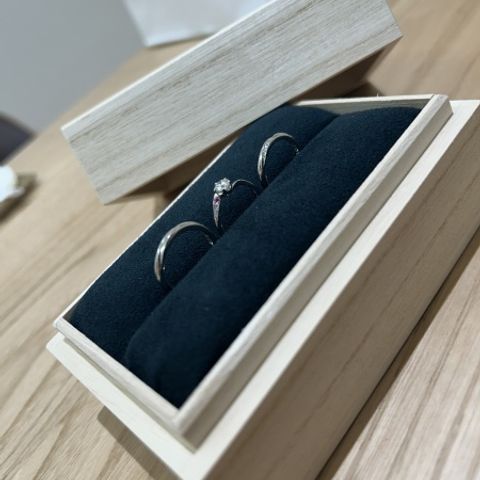 着け心地のよさ、つけている感じがしないほど手に馴染むのがすごいです。サイズ等を計測していただき、結婚指輪の前に入籍指輪という独自の指輪を用意していただき、そちらを一定期間つけて生活のしやすさを体感でき、それに応じて結婚指輪の調整ができるのが素晴らしいと思いました。自分たちは変更なしで良かったですが、安心感があるので作って良かったと思います。