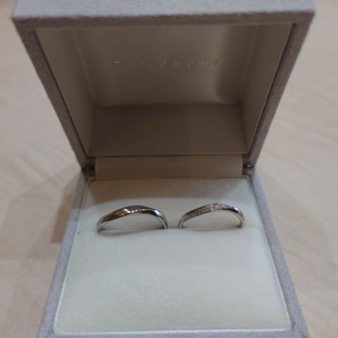 流れるようなデザインが優しい印象で好きです。 手を動かすたびにダイヤモンドがきらめくので、試着の時点で何度も手元を見てしまいました。 セミオーダーでダイヤモンドのランクを上げたことで、さらにきらめきが増してお気に入りです。 旦那の方のリングは太めですが、同じく流れるような優しいラインでいかつくなりすぎないところが良いです。