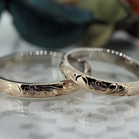 女性側はシンプルだけどすこしゴージャスなところもありとてもかわいいデザインです。 男性側は太さもえらべて男性らしいデザインも可能なところが気に入ってます。 ふたりとも素材は違うものを使ってもペア感がとてもあります。