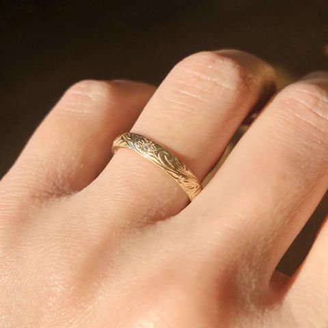 甲丸タイプにハワイアンの彫金が施されたデザインです。彫金はプロの手作業で作られてるので、とても繊細でプルメリアと葉っぱのようなデザインが可愛らしくて気に入っています。 小さなメレダイヤも入っています。 カジュアルなので普段使いしやすくて、10Kイエローゴールドですが18Kよりも硬い素材なので傷がつきづらい点も正解だったかなと思います。