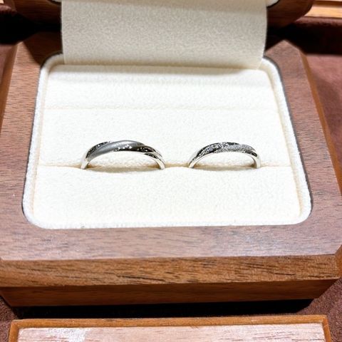 ありきたりなブランドのキラキラしたものではなく、少し変わった表面加工や、普段の服装に合うことがお気に入りポイントです。また、新婦の指輪にはダイヤが入っているものを選んだことで、婚約指輪と一緒になるような、少し特別な、でもシンプルな、そんなデザインが素敵です。
