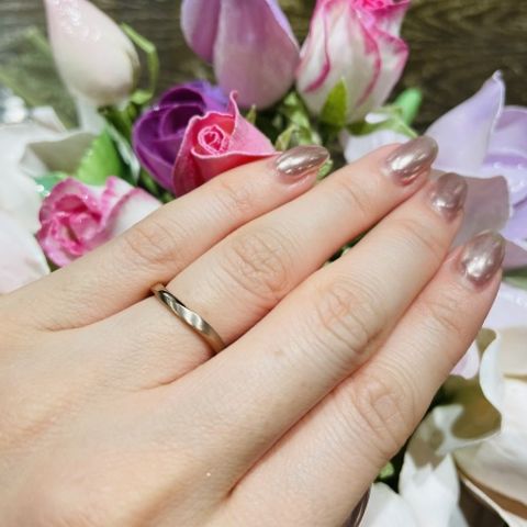 Instagramの広告で見て一目惚れをしました。パーソナルカラー的に、プラチナじゃない方がいいなと思っていたのですが、色もいくつかの中から選べたので良かったです。職人気質な夫も2種類の金属が練られたデザインを気に入ってくれました。