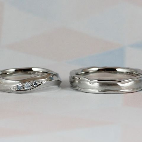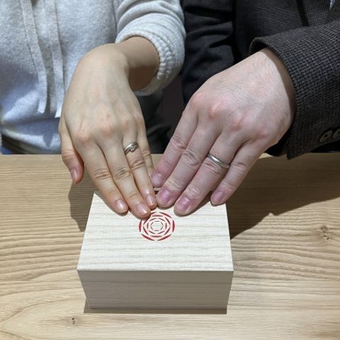 8種類の中から、「風結」というデザインを選びました。シンプルながらに華やかさもあって、洗礼されたデザインでとても気に入っています。女性用はとても迷ったのですがピンクゴールドにしました。肌馴染みも良くて浮かないデザインです。加工も、男性用は周りをヘアライン仕上がりにし、シックで落ち着いた印象、女性用は鏡面で華やかな印象にしました。 ふたりで話し合いながら作成できて思い出もできました。