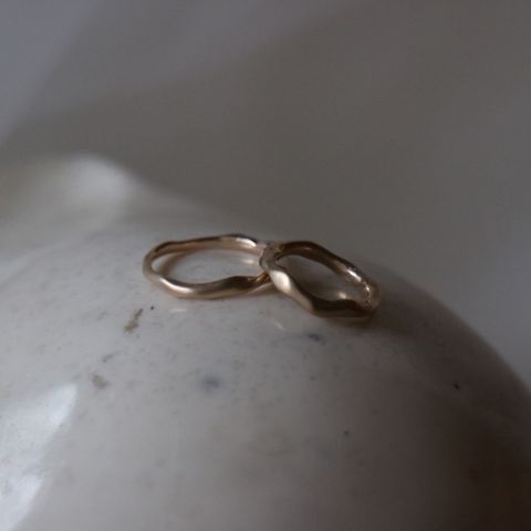 他には無いデザインを求め、"まるしかく"の形を選択しました。指にフィットしつつもデザインが麺で綺麗に表れるのがお気に入りのポイントです。 それぞれの肌色に合うよう、ホワイトゴールドとシャンパンゴールドを選びました。まるで昔からつけているかのように馴染んでいます。