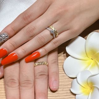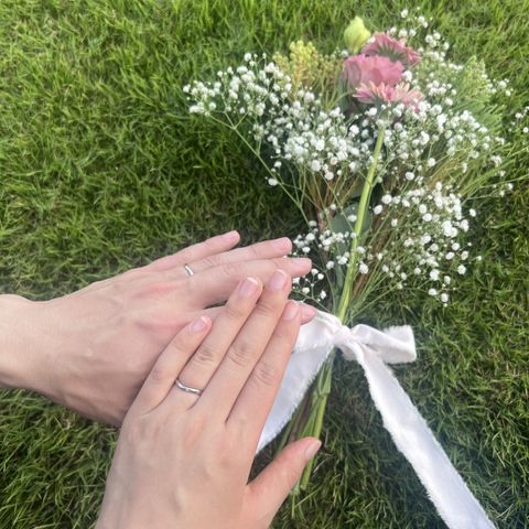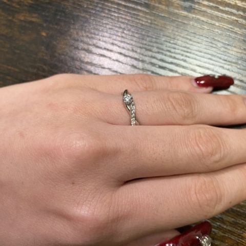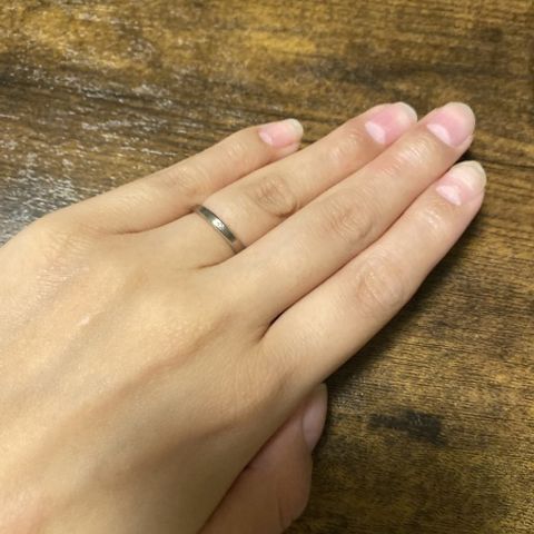 女性の方の指輪ですがダイヤの大きさが違うものがあしらわれててとても良いです。元々ダイヤモンドが入っているのは目立つ不安もあり、抵抗がありましたが大きさがちょうど良く他にないデザインなのでとても気に入ってます。 着け心地もよいのでずっとつけてたいです!