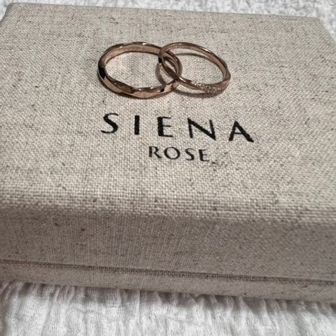 捻りがあるためシンプルなデザインながら飽きの来ないテイストに仕上がっているように思います。 材質もプラチナやピンクゴールドなどありますが、ロゼチナというシエナロゼ特有のもので作ってもらいました。日本人の肌に自然に馴染むような色合いなので、着けていても指輪が浮いているような印象を持たさず、主張がありつつも自然な着け心地です。