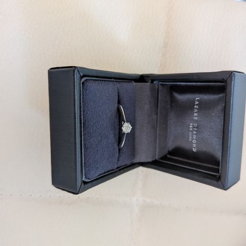 お花のようなデザインになっているのがとても魅力的で、前々から気になっていました。唯一無二のデザインで、見る度にかわいくて選んでよかったなと思います。 中心に向けて、指輪のデザインが細くなっていくことにより、ダイヤモンドが大きく見えるそうです。控えめなダイヤモンドでも、存在感のあるものになっています。
