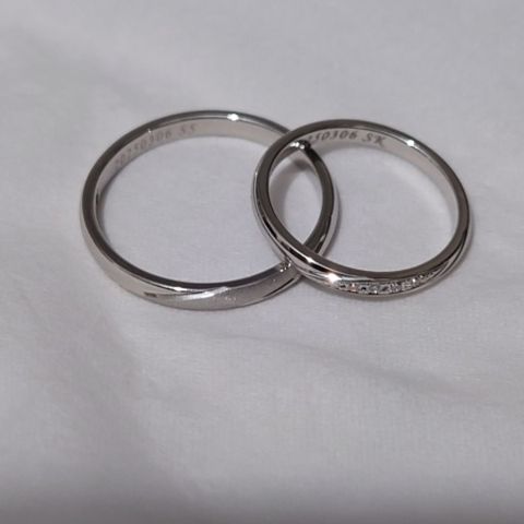 女性用の指輪はダイヤモンドが3石真ん中についていて、少し細めなストレートな形です。男性用の指輪は何もついていなく、女性のより、少し太めなストレートな形です。シンプルで日常使いできるところと、つけた心地が購入の決め手でした。