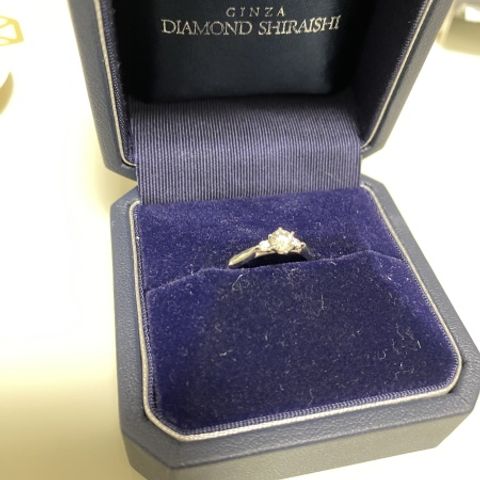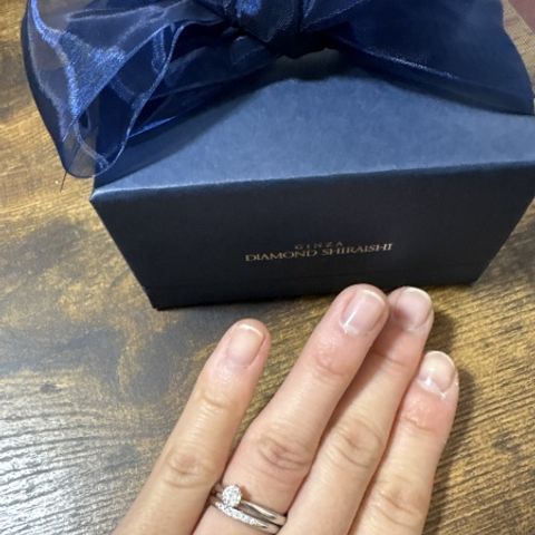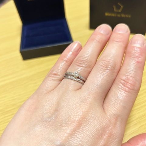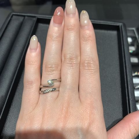 ダイヤモンドの下まで見れる4点留めが譲れないポイントでした! 重ね付けする前提だったので、婚約指輪そのもののデザインはシンプルめに。 結婚指輪を先に決めたのですが、結婚指輪のデザインをS字にしたので、結婚指輪とのバランスを考え、婚約指輪も直線的ではなく、S字ぽいものを選びました。お陰で2本合わせた時に、元々セットリングだったかのように重なりあうのはかなり気に入ってます。 ダイヤモンドも最後2択まで迷い、なかなか決められなかったのですが、顕微鏡で見せていただき、後悔することなく決断できました。