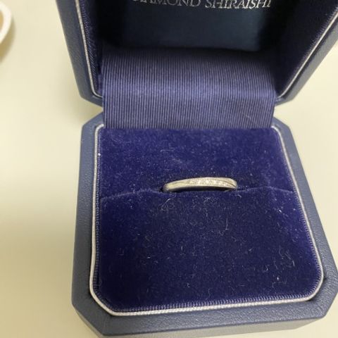 婚約指輪と重ね付けができるよう、同じBouquetシリーズで選びました。斜めのカットラインの中にダイヤが並んでいるデザインで、派手ではないもののさりげなくキラキラしているのが素敵です。輪の半分のみに石が入っているデザインにしたので、目立たせたくない時には裏側にするとシンプルになり便利です。