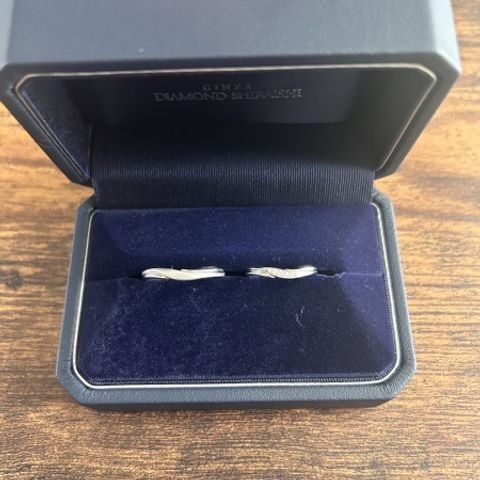 指輪のデザインはウェーブになっているためシンプルすぎず動きがあってかわいいです 婚約指輪と結婚指輪ふたつともウェーブにしたので、重ね付けした時にぴったりでした 自分たちでも調べてから行きましたが、スタッフさんにもオススメされたので満場一致で決まりました