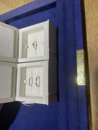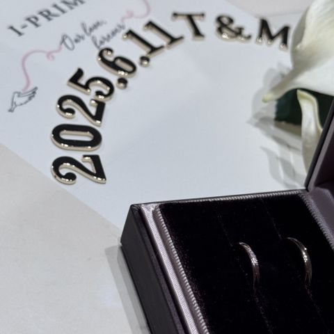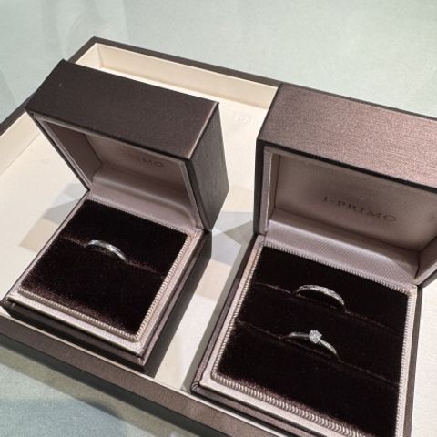 婚約指輪→一粒石か、3連のものにするか迷いましたが、一粒石のものにしました。3連のものだと、キラキラ具合は良かったのですが、やはり飽きのこないベーシッ クなデザインなものが良かったのと、一粒石の方が、カジュアルすぎない感じが良かったです。 結婚指輪→パートナーとお揃いのデザインがよく、お揃いのものがあるものを購入しました。私のはダイヤが斜めに入っているデザインで、パートナーのものは、ダイ ヤは入っておりませんが、斜めにラインが入っていて、そこの境目でリバーシブルデザイン、普通のシルバーと、マットデザインのもので、日によって変えられるのが 良かったです。