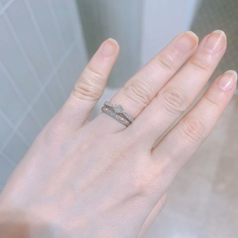 指輪の形がとても綺麗で流れるような形なので指も細く見えダイヤモンドも光り輝いてます。またエンゲージリングの方も重ね付けした時により一層輝きが増しデザインはシンプルでありつつエレガントさがある所が気に入っています!