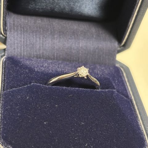 彼がプロポーズの為にストレートタイプのものより指が少し長く見えるようV字タイプの指輪を購入してくれました。シンプルなデザインですが、3つダイヤが付いているのがとても可愛く、派手すぎず控えめすぎない感じがとても好きです。