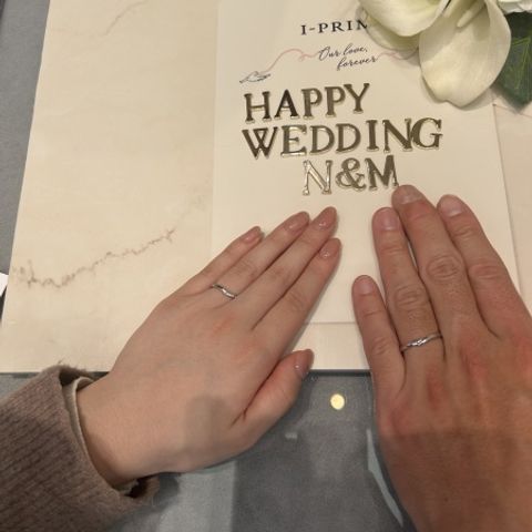 シンプルなデザインの結婚指輪がよかったので、平甲丸ストレートの指輪を選びました。 肌に馴染むピンクゴールドを勧めていただき、実際に着けてみるとしっくりきたのでそれに決めました。 メッセージではなく自分達で考えたオリジナルの刻印を入れたので満足しています。