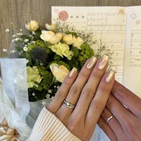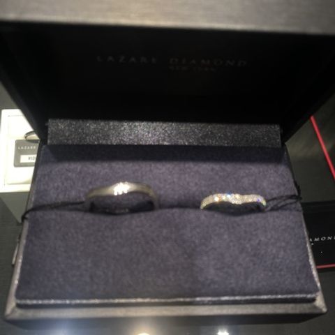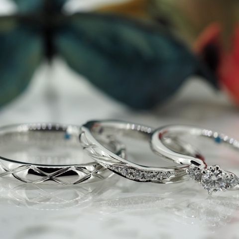 婚約指輪はシンプルなソリティアの中から、真ん中のダイヤモンドと指が美しく見えるよう、ダイヤの両サイドが少し細くなったデザインが気に入り選びました。 女性用の結婚指輪は斜めにダイヤモンドがあしらわれ、真ん中には一粒のメレダイヤが埋め込まれた他では見たことのないデザインだったのと、セットの男性用も一部マット加工を施したおしゃれなものにしました。価格は少し想定より上でしたが満足しています。