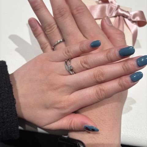 デザインがメインのダイヤの横にブルーダイヤを並べる珍しいもので、とても気に入っています。パートナーの指と好みにバッチリ合った仕様で、お互いの存在感を引き立て合いながら、上下を反対にすることで、結婚指輪との重ね付けと合わせて4パターンの組み合わせが楽しめるのが最高です。