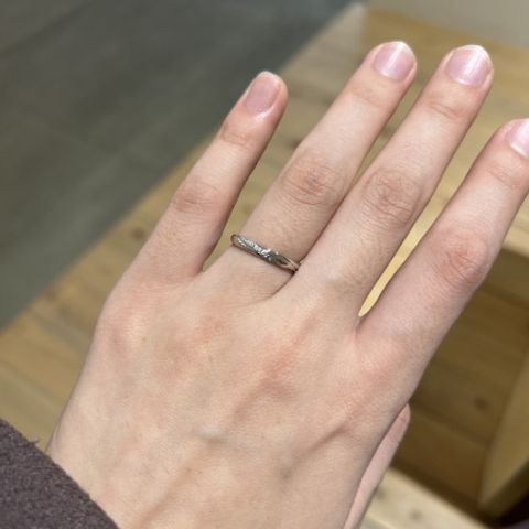 ウェーブがかかっていて指が綺麗に見え、自分の指に合ったデザインを選ぶことができました。またデザインも数多くある中から、店員さんと一緒に似合う物を選ぶことができ、大変満足のいく仕上がりになっています。男性リングのマット加工も良い仕上がりになっていて良かったです。
