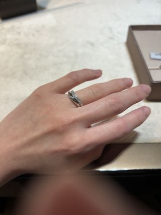 種類が豊富でかなり迷いましたが、こちらを見せていただいた時、これが良い!!!とビビッときました。笑 V字にキラキラがついていて、少し細身のデザインが 私の指に合っていて、とっても可愛いです。 予算以内におさまったのもポイントです!