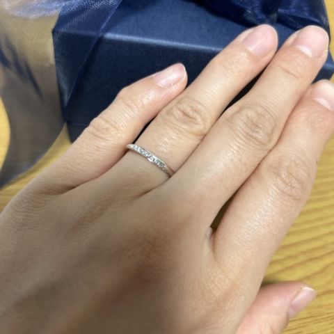 もともと、仕事の時にもつけていられるシンプルなものを探していました!色々試しにつけてみましたが、選んだ指輪は、シンプルなデザインで、付け心地もいいのでとても気に入ったため、こちらに決めました。さりげないダイヤがポイントです