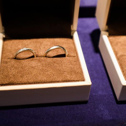 指輪のデザインはウェーブデザインで、薬指から小指にかけて斜めに下がるようなデザインを選びました。材質はプラチナで、内側にはイニシャルを掘ってもらいました。奥さんは同様のデザインで、中央にダイヤモンドが入っているタイプを選定しました。
