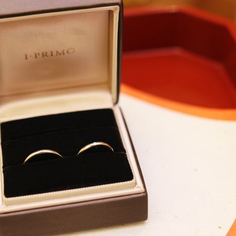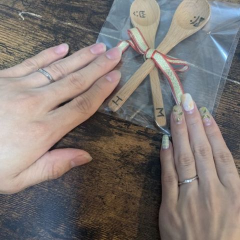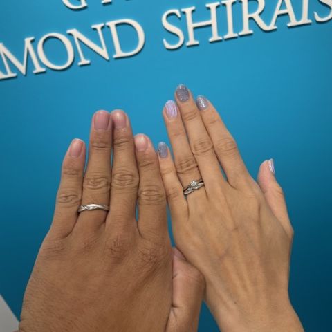 手を見てもらったときに、2人とも指が長い方だということで、より指が綺麗に見えるような指輪を選びました。婚約指輪はセットではないですが、重ね付けできるようなデザインのものを選びました。また、結婚指輪は毎日仕事でもつけるつもりだったので、ダイヤは控えめです。