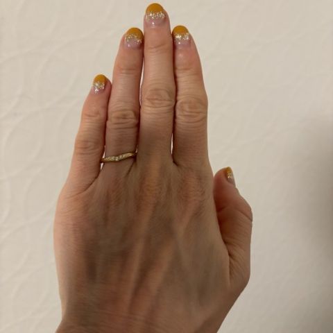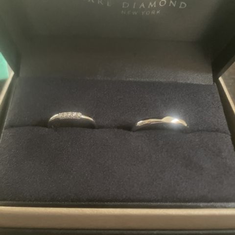 婚約指輪のダイヤがキラキラでとても綺麗で結婚指輪で選んだセットリングも2つ合わせて着用するとよりキラキラで素敵で手元がとても華やかになります。 結婚指輪の方は普段使いにもしやすいデザインで職場にもつけやすいのでとても嬉しいです。