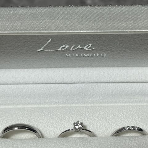 王道のシンプルなデザインが好みであったため、ミキモトさんで購入しました。シンプルながら日本人の指に合う設計をしているとのことで、つけた時他のブランドよりも指が綺麗に見えました。結婚指輪も最初はダイヤが付いていないものを希望してましたが、ダイヤの質も良く、小さくてもキラキラしていたためダイヤ付きに決めました。重ねた時のバランスもとっても良くて気に入ってます。