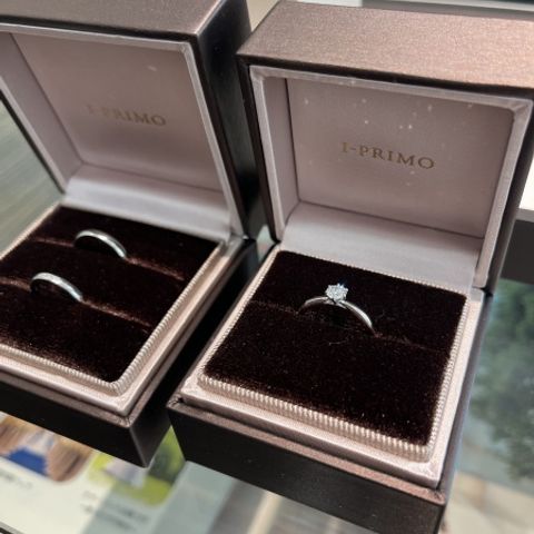 婚約指輪は爪4本、正面から見た時にダイヤが浮いてみえる、ダイヤを支えてる所の中間からリングが出てる事などかなり拘って探しました! 結婚指輪はお互い好きなデザインで、彼は1粒ダイヤ入り、私は半分ダイヤ付きで注文しました。