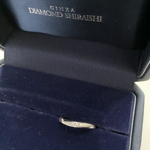 シンプルで付けやすい指輪です。婚約指輪と重ね付けしても可愛いデザインです。指輪の内側には、レーザー刻印をしていただきました。ダイヤモンドシライシの名前のとおり、ダイヤモンドが素敵で、キラキラと輝くお気に入りの指輪を選ぶことが出来ました。