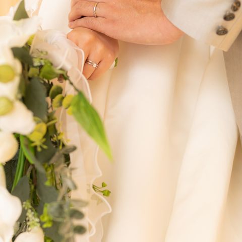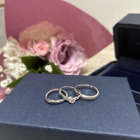 重ね付けしたかったので、婚約指輪と結婚指輪を一緒に購入しました。こちらはウェーブタイプの指輪ですが、婚約指輪の斜めの角度と同じなので重ね付けした時にとてもしっくり来ました。新郎新婦ともに細めの指輪を探していたのでとても好みでした。