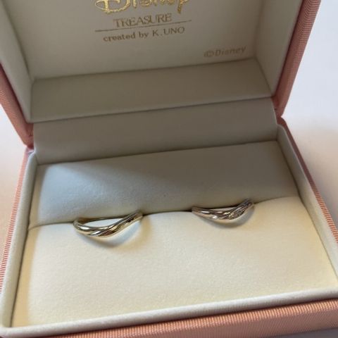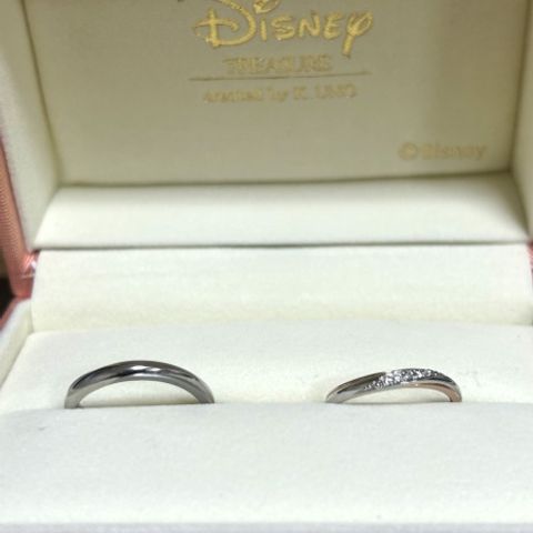 結婚指輪は写真だと見にくいのですが、内側に色が付いており女性はピンクゴールド、男性はゴールドになっています。またバラの刻印があります。 標準では女性はダイヤ付きですが、よりシンプルな物が欲しく外しました。 その分お値段も少し下がりました。 ディズニーコラボなので内側の刻印に制限があるそうですが、イニシャルや記念日は大丈夫だそうです。 とても気に入っています。