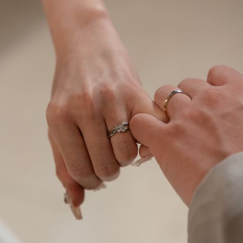 結婚指輪には、しめ縄を前に手を合わせ、ふたりのご縁に感謝する。縁を結ぶという思いが込められており、デザインもしめ縄をイメージした、他のブランドにはない素敵なデザインです。婚約指輪は、ダイヤモンドの留め具にゴールドが使われているところがお気に入りポイントです。