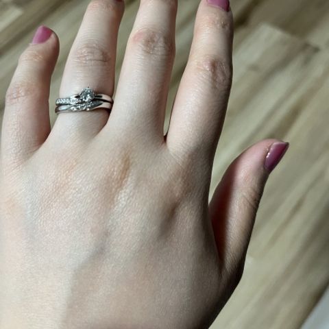 指輪のデザインについては 別々のデザインでつけられる方もいると聞いていましたが、やはりペアがいい!!となってしまい。 2人で探していたところ、こちらの指輪はペアでお互いが納得のいくものがやっと見つかった!!と言った感じでした。 あとつけ心地がとてもいい。 ダイヤたっぷりのギラギラがいい!と思ってましたが、 長くつけるならシンプルもいいな、、 色々考えた結果、シンプルとキラキラのちょうど中間! 意外とないデザイン!とっても気に入りました!