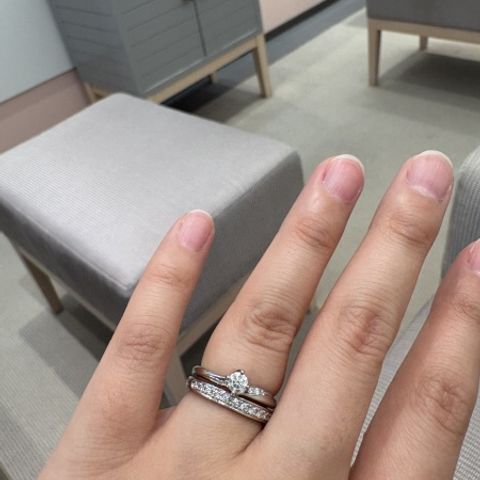 最初、特に具体的な希望がない状態で立ち寄りましたが、デザインも沢山ある中で色々試着させていただき、2人の好みなどもわかってきて、一番しっくりくるものを選ぶことが出来ました。婚約指輪のダイヤの一部を2人の結婚指輪に入れることができたのも嬉しかったです。婚約指輪との重ね付けも合い、指も綺麗に見えるのでこちらに決めました。