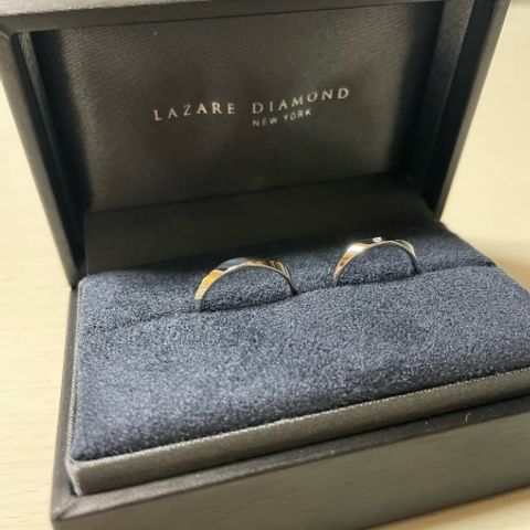 普通の照明の下でもキラキラしている。 斜めにダイヤが入っているのでダイヤの数が多い。 婚約指輪と合わせることができるように、シンプルな結婚指輪を選んだが結婚指輪だけでもかわいい。 男性の結婚指輪にも模様が入っているのでお揃い感が出て良かった。