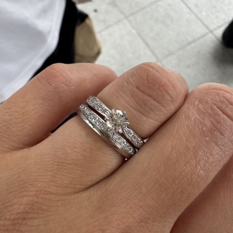 婚約指輪と重ねづけできる指輪にしました。川の流れのよいに婚約指輪と重ねたからと綺麗にダイヤモンドが流れる様な形になるのが自分の好みだったのでこちらにしました。シンプルなデザインですが自分からでもわかりやすい煌めきを感じれるのでお気に入りです。