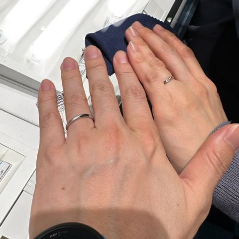 形は直線的ですが、捻ってあるようなデザインに惹かれました。普段からつけて生活したいと思っていたのでシンプルなデザインで洋服にも合うところも気に入っています。値段も予算に収まり、お互いの好みでした。女性の指輪の方に小さなダイヤモンドが埋め込まれているところも好きです。