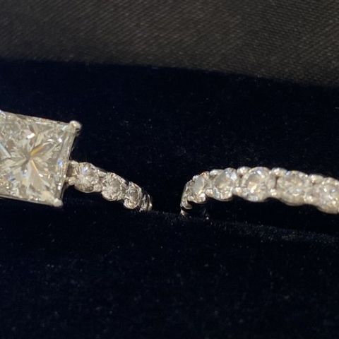 「2カラットのプリンセスカット(真四角)のダイヤモンド」が婚約指輪の理想だったので、それを実現しました。婚約指輪は、ダイヤモンドの形に合わせた型をオリジナルで作ってもらいました。結婚指輪はエターナルにし、使用するダイヤモンドは専用のスコープで観察するとハート&キューピッドが見えるものにしました。