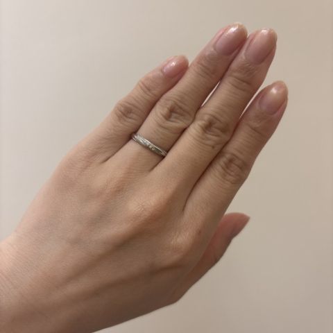 はじめにサイズをどうするかすごく悩んでいたんですが、0.5号刻みでサイズがあり手に馴染むサイズになりました。また、デザインも自分の好きなように加工を入れることができ、入籍指輪をつけてる期間1ヶ月間悩めたので納得のいくデザインができました。