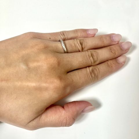 職人の手作りで唯一無二のところが気に入ってます。結婚指輪を買い、ダイヤのあるデザインのものにしました。指で光ってるのをみるとテンションがあがります。ななめのラインが多少指を細く見せてくれてるのかなと。