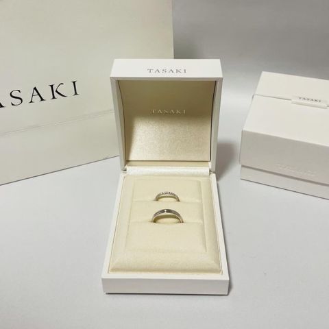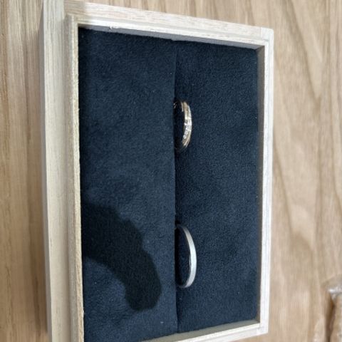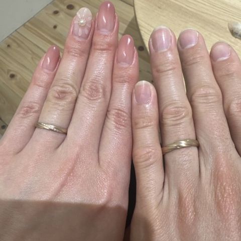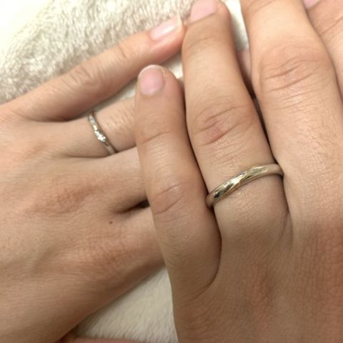 結婚指輪ということで対っぽさを出すために同じプラチナでウェーブデザインにしました。別の所で見たときにダイヤは必須だねとなり私に指輪だけダイヤをつけました!事前に着け心地を知るための入籍指輪もあり安心して結婚指輪をお願いできました。