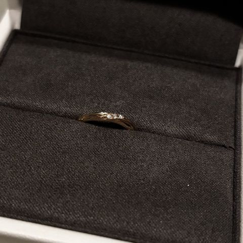 元々このデザインにしようと決めていましたが、ダイヤモンドが3つのものより、5つのものに決めました。とても綺麗です。 ねじれている形なので指が長く見えます。 着け心地もとても良いです。 普段からつけっぱなしでも、ストレスなくつけられそうです。 太過ぎないので、手を握った時も違和感なくつけていられます。 カジュアルな服装にも合いそうなデザインなので、色々な服装で楽しめると思います。