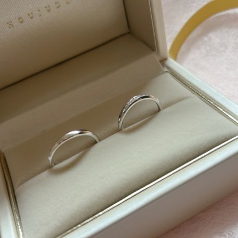 ダイヤモンド一石のシンプルなデザインを探していたので、まさにこれという感じでした。夫とは別のデザインを選びましたが、どちらもウェーブのデザインでしたので、それほど気にならないですし、むしろ自分の納得するものが選べたのでよかったです。