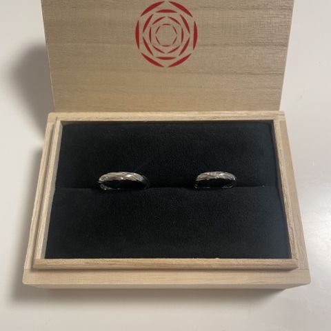 風結のデザインは女性のみ石付きだったのですが、おそろい感を増すために石をのけたデザインにして頂きました。職場でも付けるため、キラキラしたものよりも落ち着いたデザインにしたく、表面加工はホーニング処理にしました。かっこいいデザインで気に入っています。