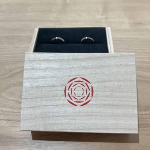 シンプルなデザインを探している中で、店員さんからオススメされた指輪でした。オーソドックスな指輪も良かったのですが、彼女と相談して少しシャープさのあるデザインにしました。ケイウノさんでは、指輪の裏側にオリジナルデザインを彫刻してくれるとの事で、出会いの記念になった桜を掘って頂きました。
